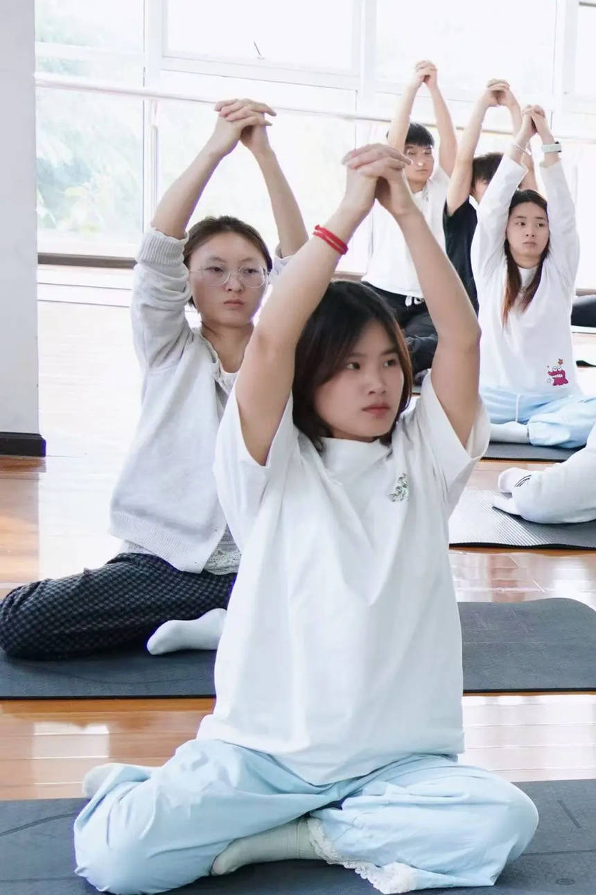 舞韵瑜伽将瑜伽的静态体式与舞蹈的动态韵律完美结合,配以舒缓优美的音乐,在塑造体态、舒展身心的同时,融入肢体美学、节奏美学与情感表达,是兼具健身、美体、心灵疗愈与美育熏陶的现代身心练习方式。它以柔和的艺术形态引导练习者感知身体之美、韵律之美、宁静之美,助力培养审美感知力与艺术表现力,契合高校美育“以美育人、以美化人、以美培元”的核心要求。